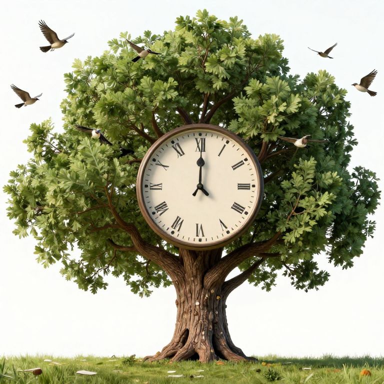 A surreal 3D-rendered scene depicts a giant oak tree seamlessly integrating a large clock face into its trunk, symbolizing the harmonious blend of nature and time, with birds flying rhythmically around it, evoking a whimsical and imaginative artistic style.