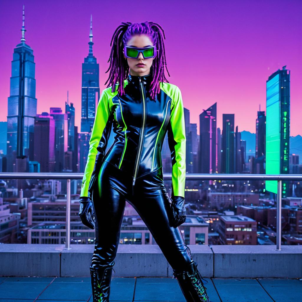 Image in the style of Vaporwave, edgy cybernetic genius, electric purple dreadlocks, slender muscular, (Leather & Latex Catsuit:1.3), neon green cyber jacket, augmented reality glasses, combat boots, gradient city skyline with holographic ads studio background