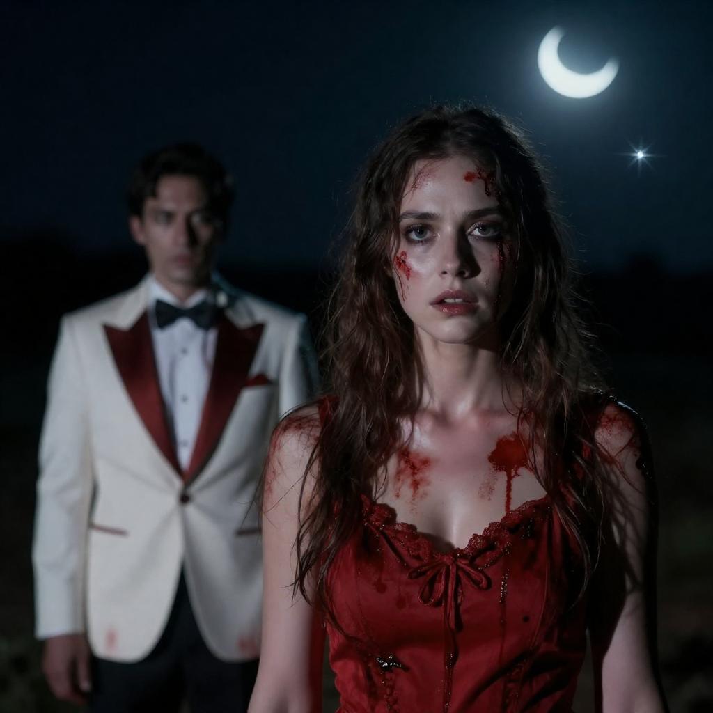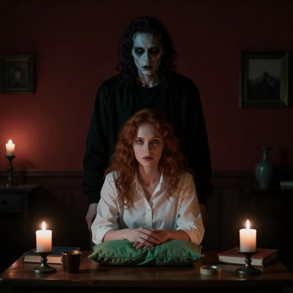 Photograph of a group of six men and one woman in a dark, rustic setting. The woman, with white face paint, red curly hair, and black dress, stands in a stone basin. Men wear hats, vests, and shirts, looking at her with varying expressions of surprise and curiosity. One man with hand on cheek and another with hand to chin. Stone basin in foreground, wooden beams in background.