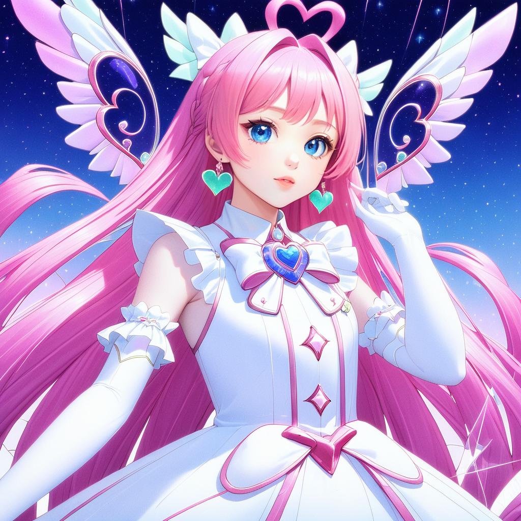 Anime-style illustration of a magical girl with long pink hair and blue eyes, wearing a white sleeveless dress with pink accents. She has white elbow-length gloves, heart-shaped earrings, and a large winged wing brooch. A heart-shaped hair accessory and a braid adorn her hair. The background features a starry night sky.