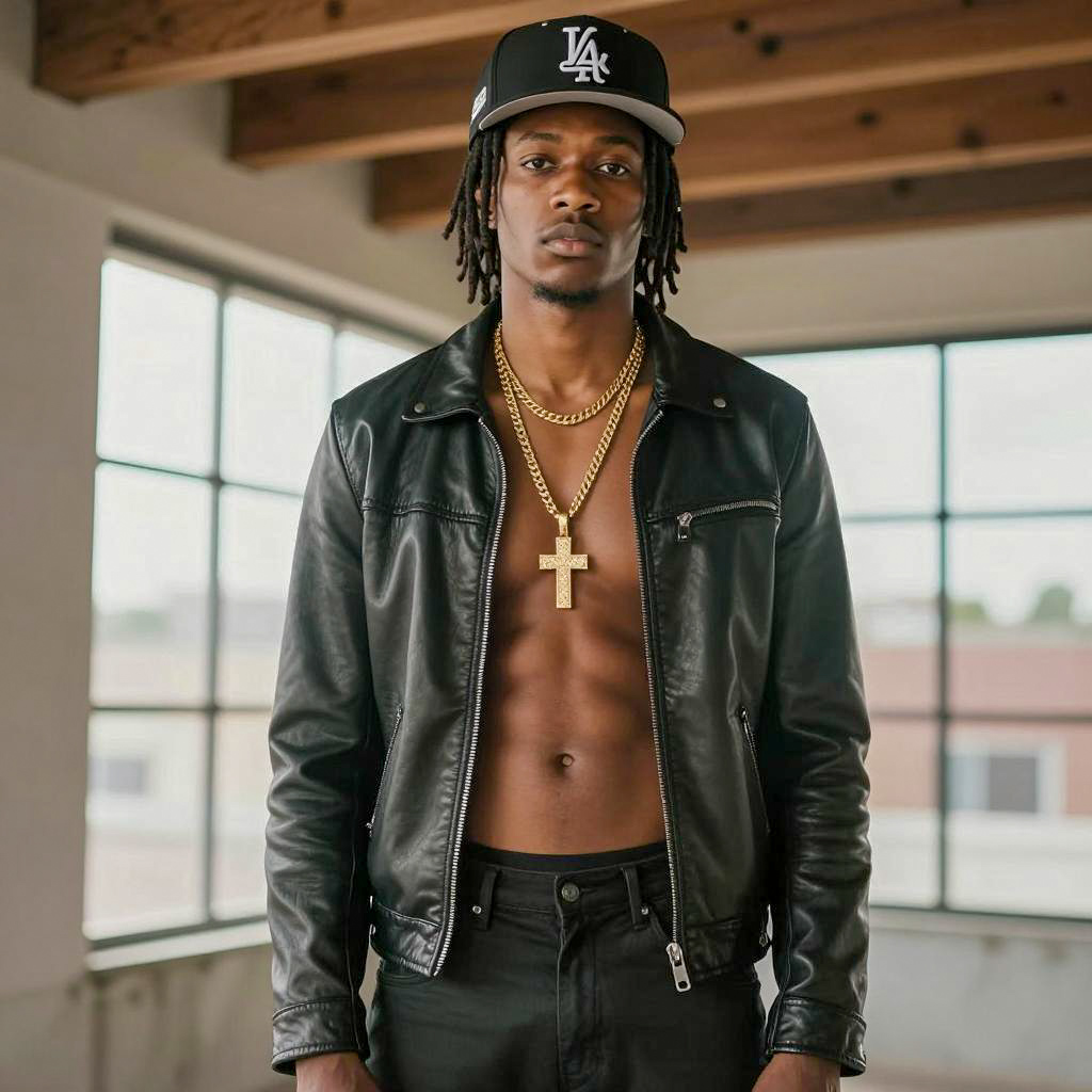 Portrait of a young Black man standing indoors in an urban setting. He wears a black leather jacket with no shirt underneath, black pants, a black baseball cap with a white LA emblem, and multiple gold necklaces including a large cross pendant. The background features large windows, wooden ceiling beams, and natural daylight highlighting his medium-dark skin tone and mid-length dreadlocks. The man has a serious expression and a tall, lean build.