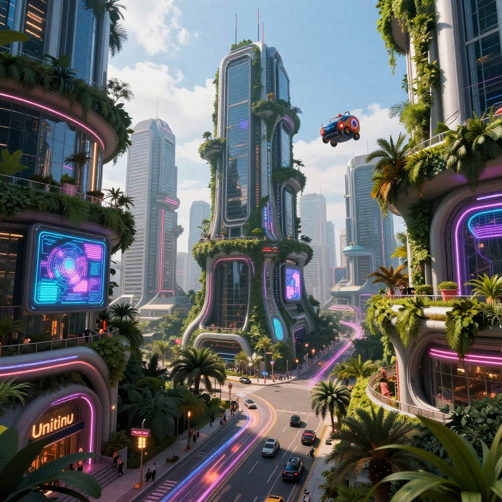 Unitinu, a futuristic cityscape bathed in neon lights, blending advanced technology with organic architecture, towering skyscrapers intertwined with lush greenery, vibrant energy pulses through the streets, cyberpunk atmosphere with glowing holograms and flying vehicles.