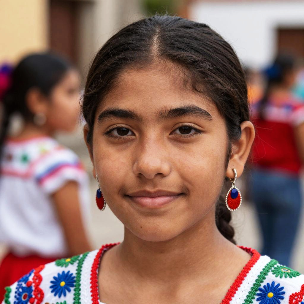 Mexican thin eyebrows on a beautiful young woman, natural light, soft focus, vibrant cultural background, traditional clothing, high detail facial features