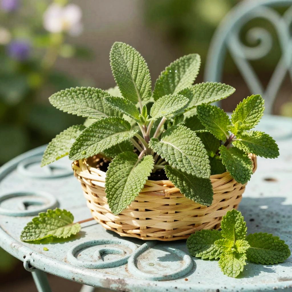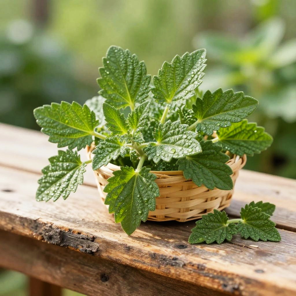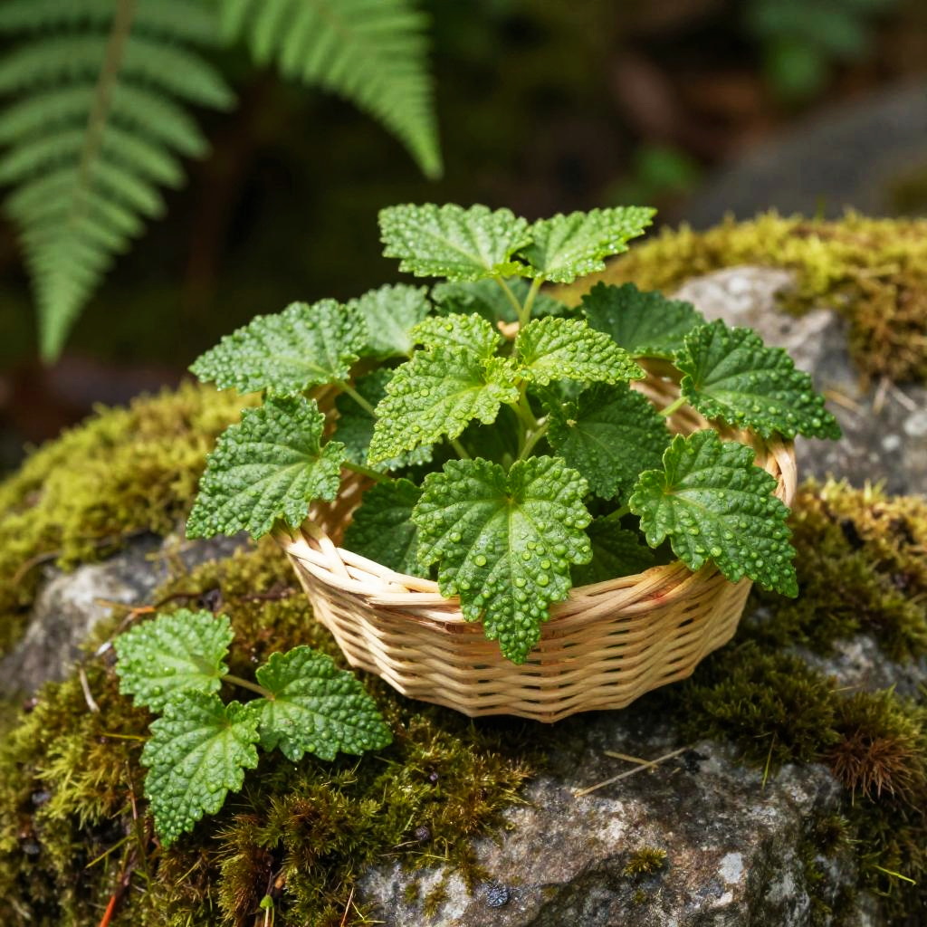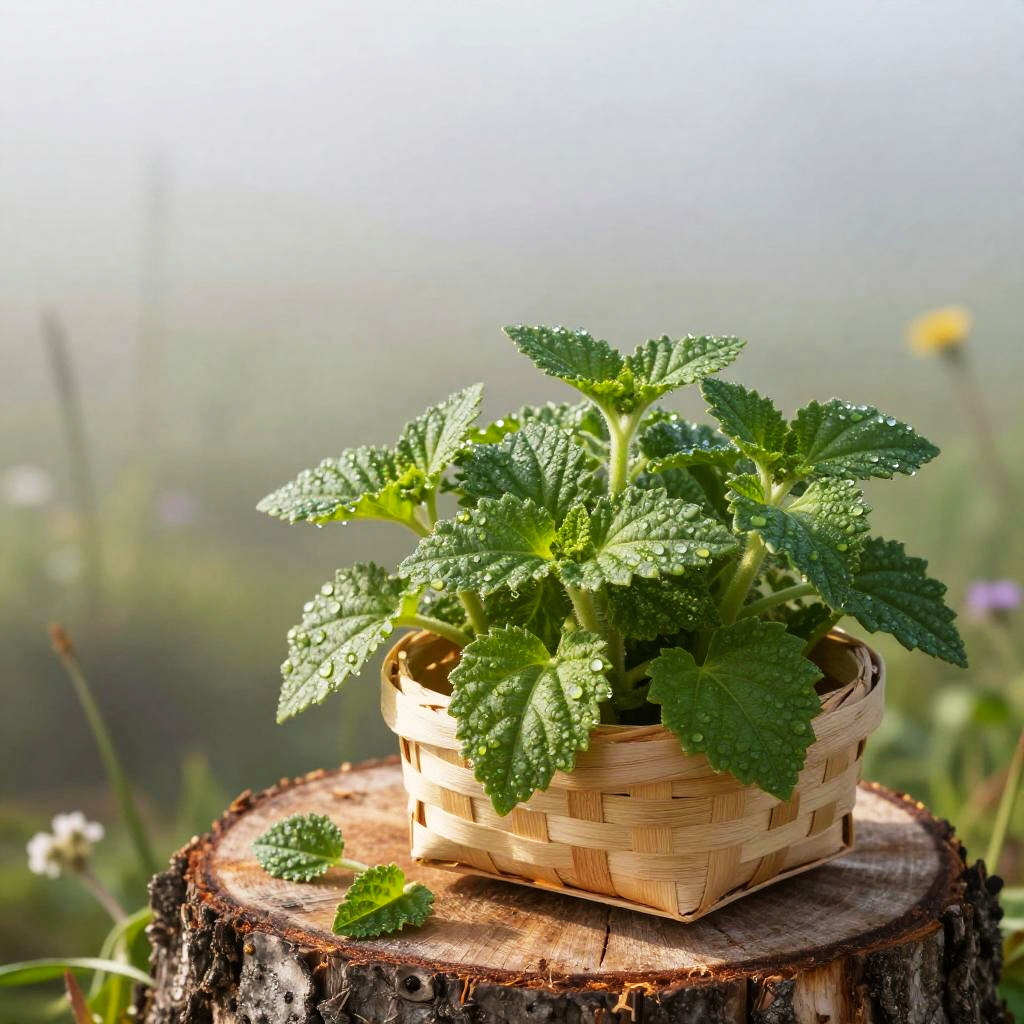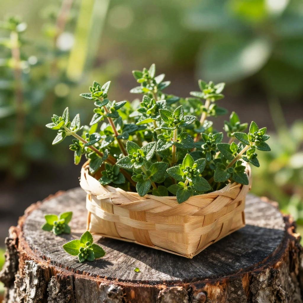 Crisp morning light garden herb photograph of thyme sprigs on a rough bark tree stump, a small handwoven basket overflowing with vivid green sprigs, a few leaves scattered nearby. Leaves are crisp, bumpy, and slightly glossy, veins defined, occasional dewdrops catching the light. Background softly blurred with hints of wild forest foliage; natural light creates bright highlights and soft shadows. Shallow depth of field, high detail, natural color, clean composition, tactile texture, fresh and inviting.