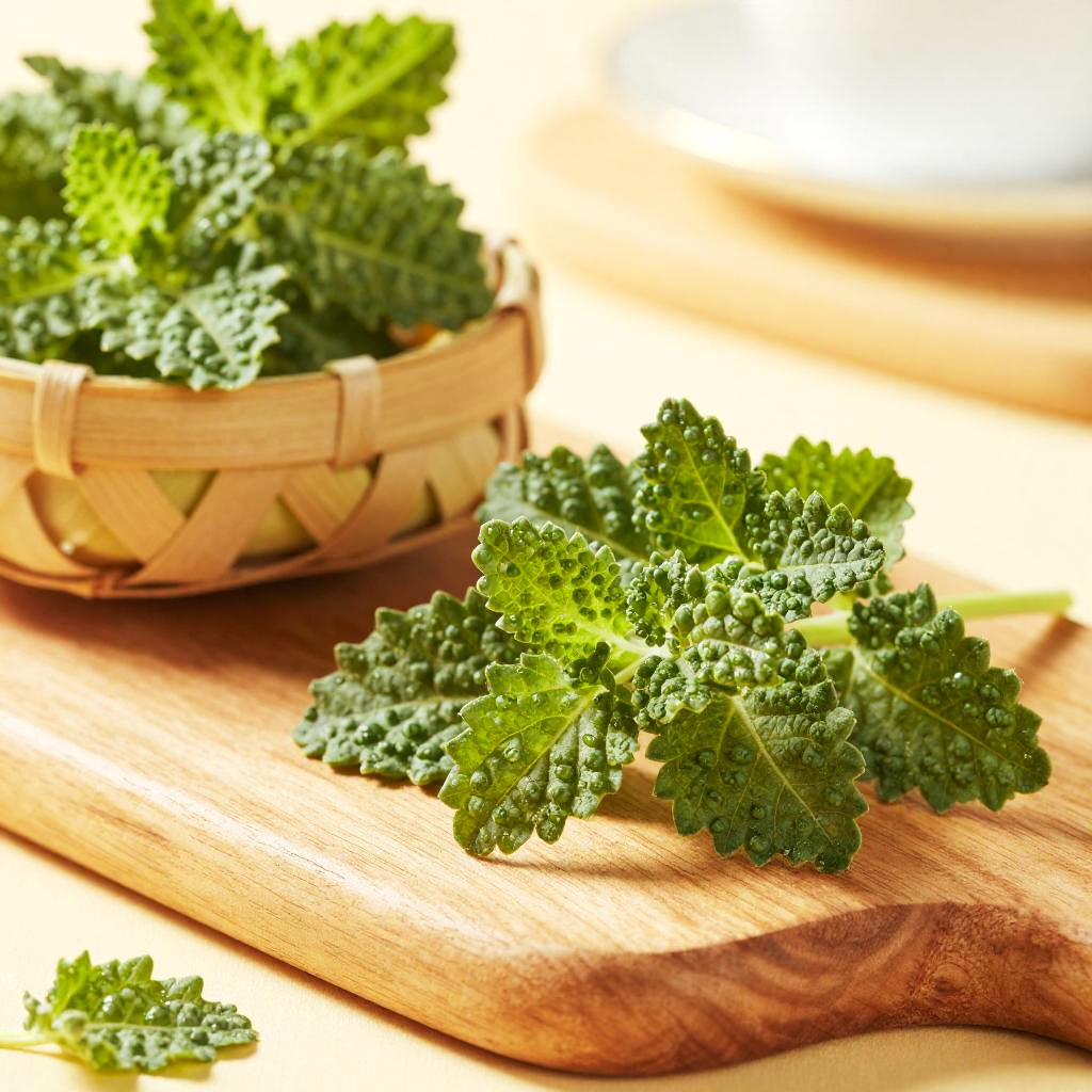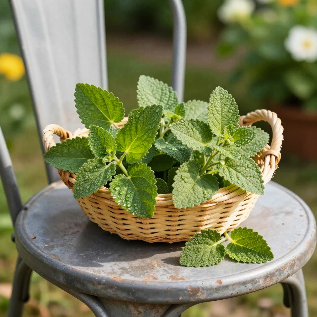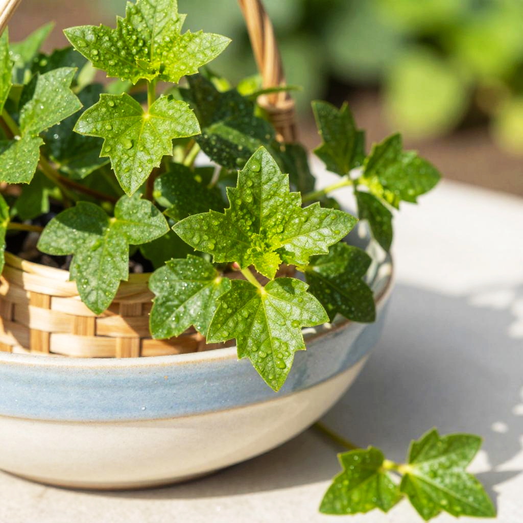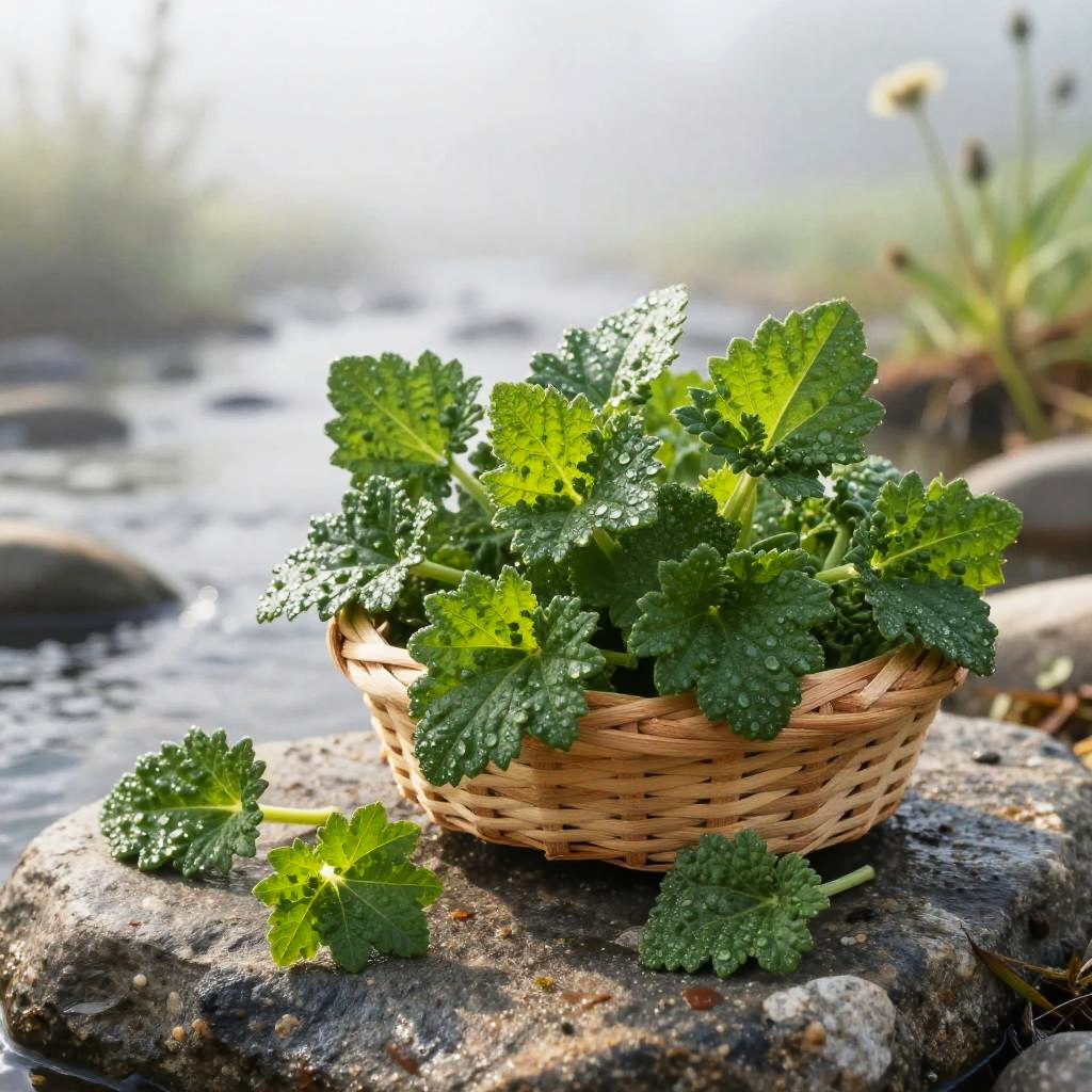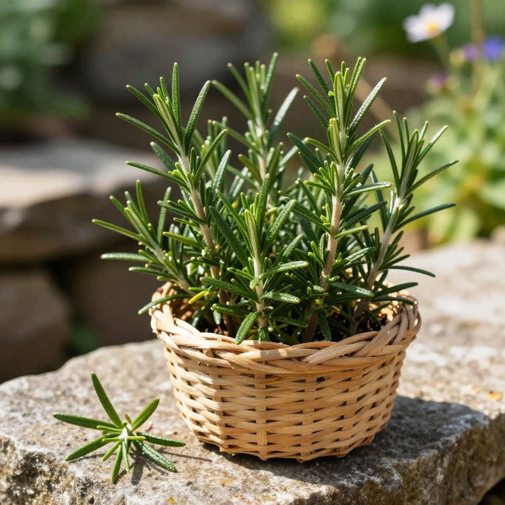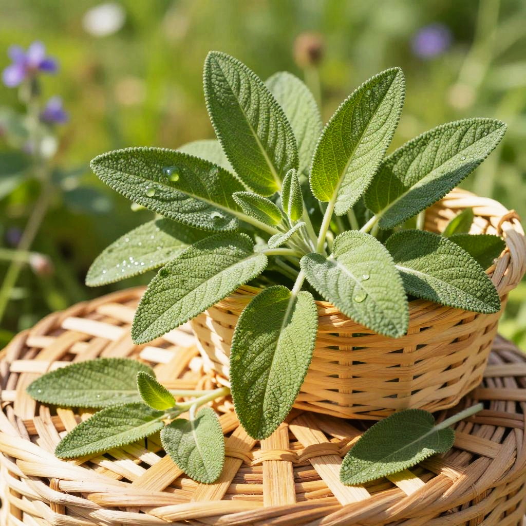 Crisp morning light garden herb photograph of thyme sprigs on a rough bark tree stump, a small handwoven basket overflowing with vivid green sprigs, a few leaves scattered nearby. Leaves are crisp, bumpy, and slightly glossy, veins defined, occasional dewdrops catching the light. Background softly blurred with hints of wild forest foliage; natural light creates bright highlights and soft shadows. Shallow depth of field, high detail, natural color, clean composition, tactile texture, fresh and inviting.