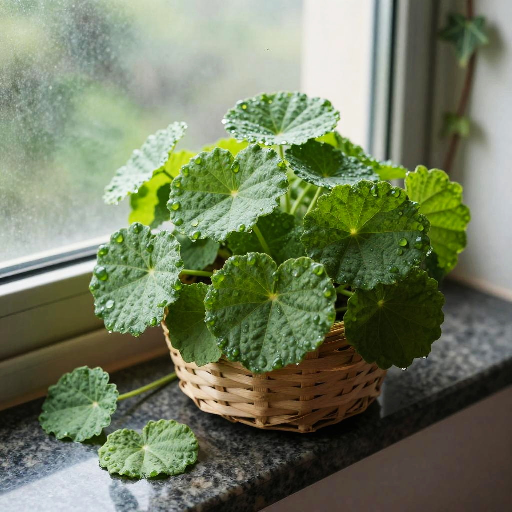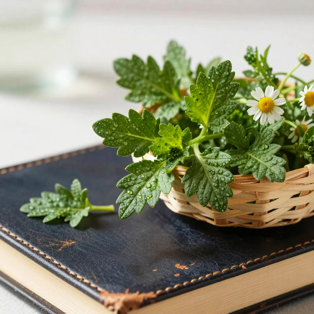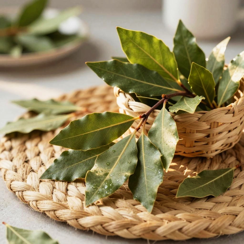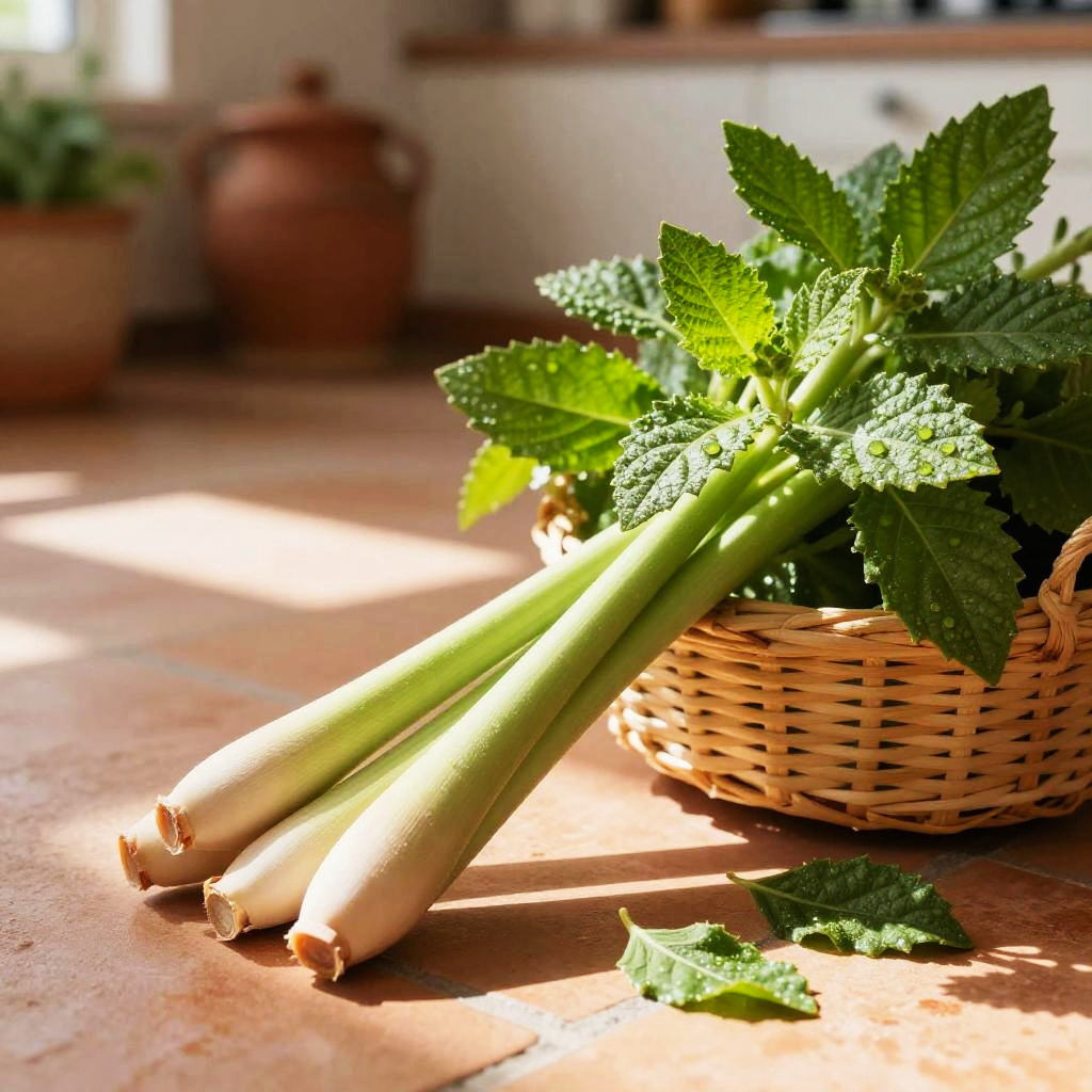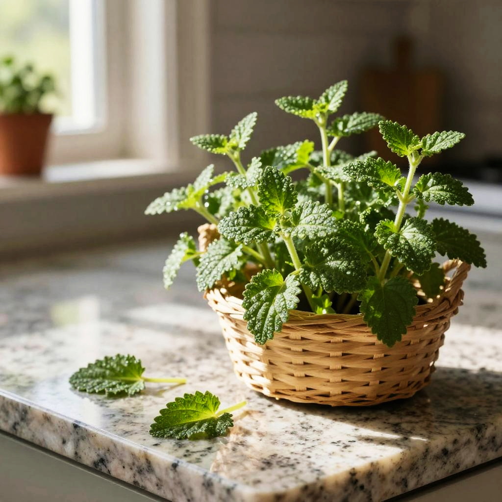 Crisp morning light garden herb photograph of thyme sprigs on a rough bark tree stump, a small handwoven basket overflowing with vivid green sprigs, a few leaves scattered nearby. Leaves are crisp, bumpy, and slightly glossy, veins defined, occasional dewdrops catching the light. Background softly blurred with hints of wild forest foliage; natural light creates bright highlights and soft shadows. Shallow depth of field, high detail, natural color, clean composition, tactile texture, fresh and inviting.