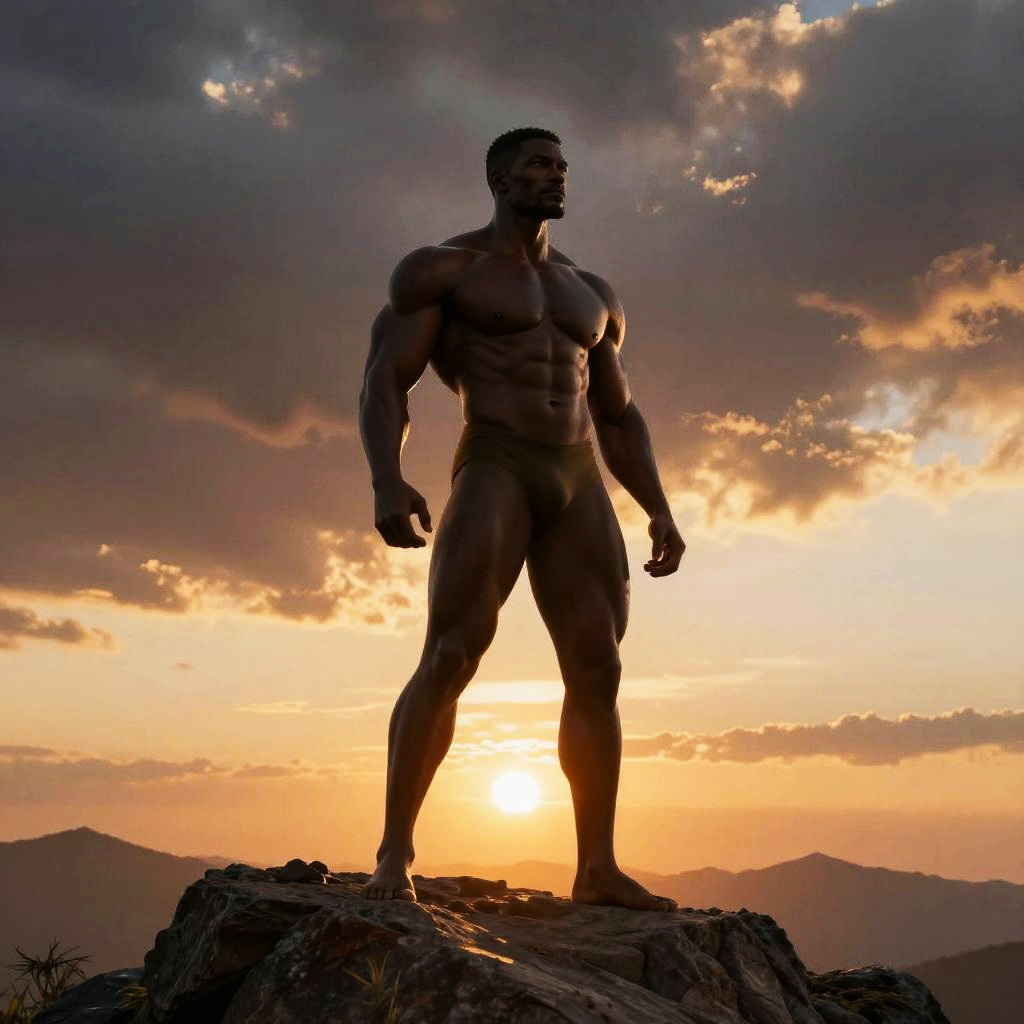 Black muscle man standing heroically on a rocky mountain peak at sunset, muscles glowing in golden light, epic background, dramatic sky, realistic anatomy, cinematic aura, bold and inspiring