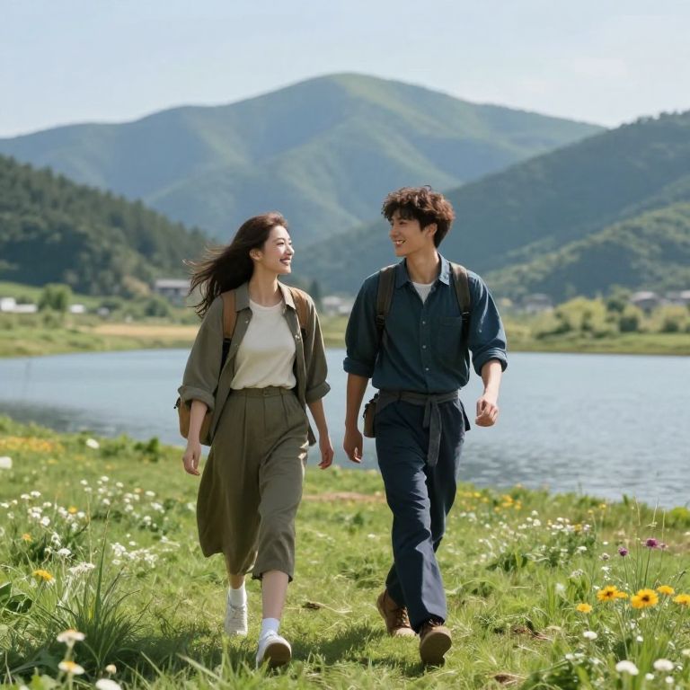 Photograph of an Asian couple walking down a narrow, outdoor market street. The woman, with long black hair, wears a gray hoodie and beige pants, smiling at the man. He has short black hair, a dark gray graphic T-shirt, and blue jeans, also smiling. Both are wearing white sneakers. The street is lined with tables covered in white cloths displaying loaves of bread. The background shows blurred storefronts with awnings, green plants, and a slightly overcast sky. The couple's casual, relaxed demeanor contrasts with the busy market atmosphere. The image is bright and colorful, capturing a lively, urban setting.