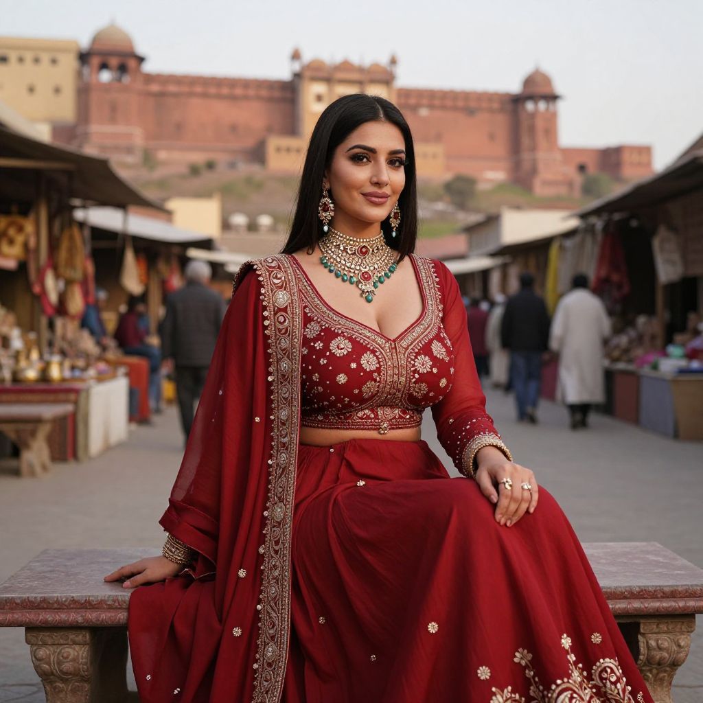 A modern fashion-forward woman with a soft smile and straight black hair, wearing a luxurious red salwar suit as a costume, sitting on a stone bench in a heritage market in Jaipur, with intricate jewelry and the silhouette of ancient forts in the distance.. The woman has big tits and cute face