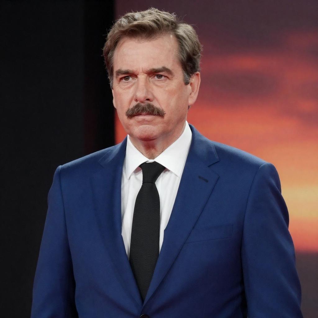 Photograph of two men shaking hands on stage. Both in dark suits, the man on the left with dark hair and mustache, the man on the right with light brown hair. Large circular emblem with Liberty statue in background. American flag on right. Dark curtain backdrop.