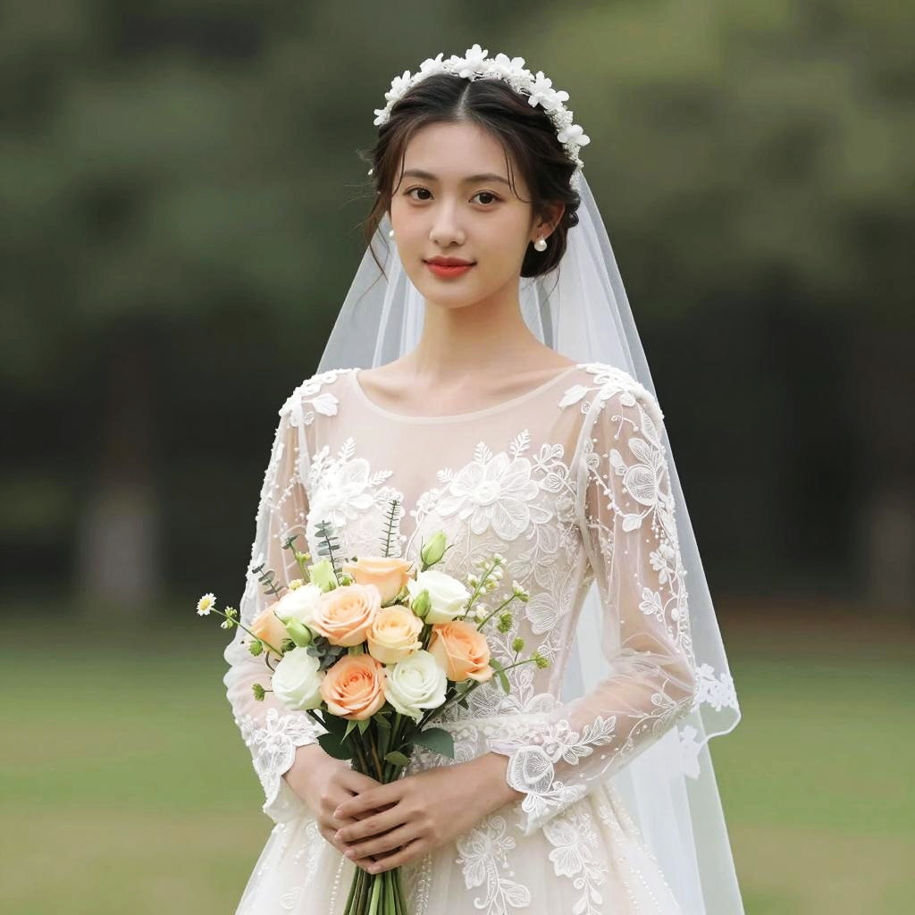Photograph of an Asian bride standing outdoors in a grassy field. She has fair skin, dark hair styled in a low bun, and wears a white lace wedding dress with long sleeves and a sheer neckline. A delicate white floral headpiece adorns her hair, and she has a translucent veil draped over her shoulders. She holds a bouquet of white and peach roses with greenery. She smiles gently, looking directly at the camera. The background is blurred, featuring green trees and grass, highlighting her as the focal point.