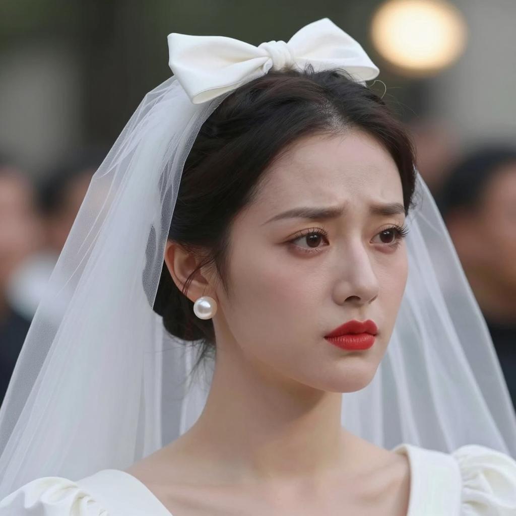 Portrait of a young Asian bride standing outdoors wearing a delicate white lace wedding dress with floral embroidery and sheer long sleeves. She holds a bouquet of soft pastel roses and eucalyptus leaves, complemented by a veil and a pearl-accented headpiece. The background features a softly blurred natural green setting.