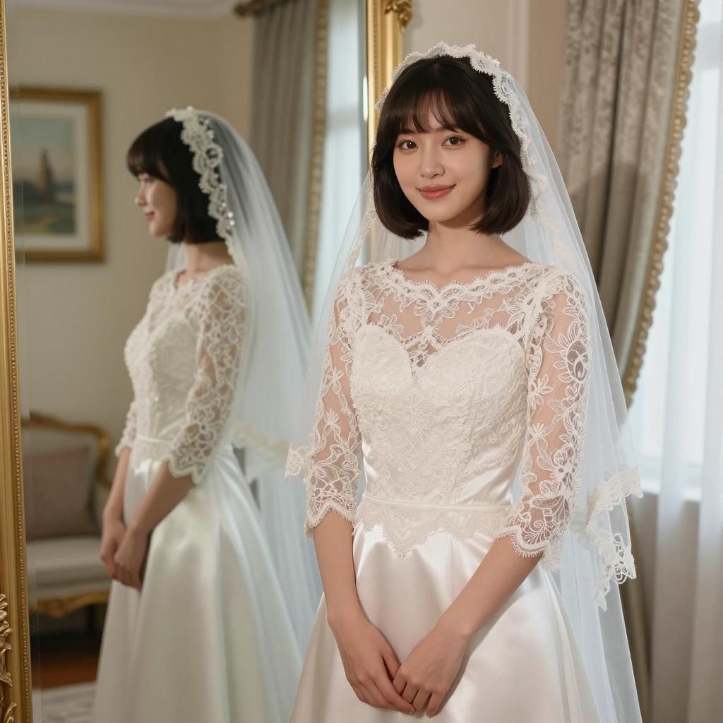 A beautiful young woman in a delicate lace wedding dress stands outdoors holding a bouquet of soft pastel flowers. The dress features intricate floral embroidery with sheer long sleeves, complemented by a veil and a subtle headpiece, all set against a softly blurred green natural background.
