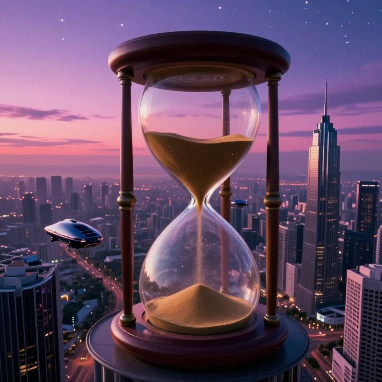 Envision a surreal, dreamlike landscape influenced by Dali-esque visions, with an enormous hourglass dominating a futuristic cityscape during twilight. From an aerial perspective, witness the sprawling metropolis adorned with its gleaming skyscrapers and hovering, aerodynamic vehicles defying gravity above the streets. The sky displays a palette of pink and purple hues blending into a cosmic horizon where distant stars sparkle like diamonds against the dark backdrop. In the foreground, the colossal hourglass releases sand that dances like liquid mercury under ambient light, creating ripples of time that distort reality around it. This enigmatic object stirs both fascination and unease, hinting at mysteries hidden within this strange new world. The image conveys a sense of awe and foreboding, with an emotional spectrum ranging from curiosity to apprehension, inviting contemplation on the nature of time and existence in this alternate reality.