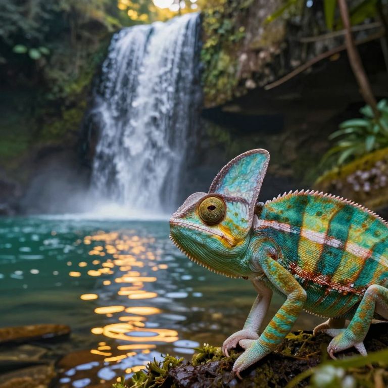An enchanting digital art composition showcasing a breathtaking waterfall gently flowing into a serene pool below, with shimmering water reflecting an alluring iridescence evocative of golden-hued paintings. The scene transitions to an intimate close-up view of a vibrant chameleon seamlessly integrating with its captivating surroundings, highlighting its extraordinary camouflage skills. This innovative perspective creates an emotionally charged gradient, encouraging viewers to contemplate the delicate harmony between nature and enigma within this mesmerizing, immersive landscape.