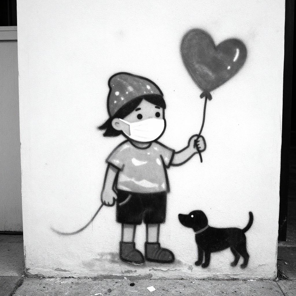 Black and white street art of a child wearing a hat and face mask, holding a red heart-shaped balloon in one hand and a dog on a leash in the other. The graffiti is painted on a rough white wall with visible texture and some debris on the ground.