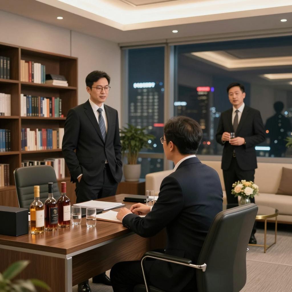 Photograph of a business meeting with six men in suits around a circular wooden table. The man in the foreground has his back to the camera. The central older man with white hair speaks, while others listen. Brown leather briefcases on the table. Orange and beige wall background. Five men in dark suits, one in a lighter suit. All men are focused on the central speaker.