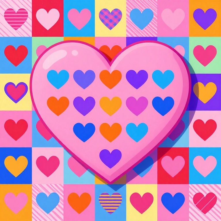 Vibrant patchwork background featuring a grid of colorful squares adorned with various heart patterns, centered by a large, three-dimensional pink heart containing smaller hearts in shades of blue, orange, and purple.