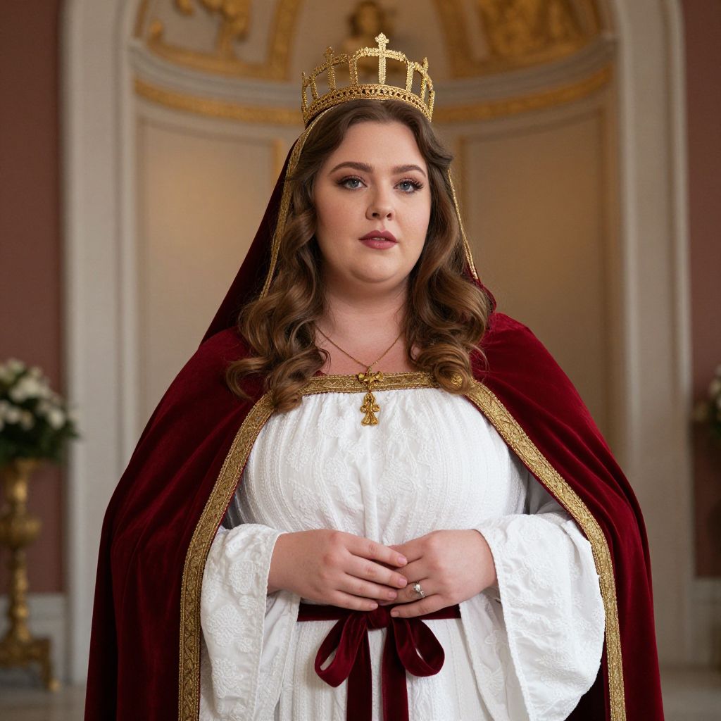 Photograph of a young Caucasian woman with fair skin and long, wavy brown hair, standing in an ornate room. She wears a gold crown and a rich maroon velvet robe with gold trim over a white, long-sleeved, lace-trimmed dress. A gold cross necklace hangs around her neck. Her hands are clasped in front of her. The background features a blurred, arched, cream-colored wall with gold detailing and a floral arrangement on the left. The lighting is soft, highlighting her serene expression.