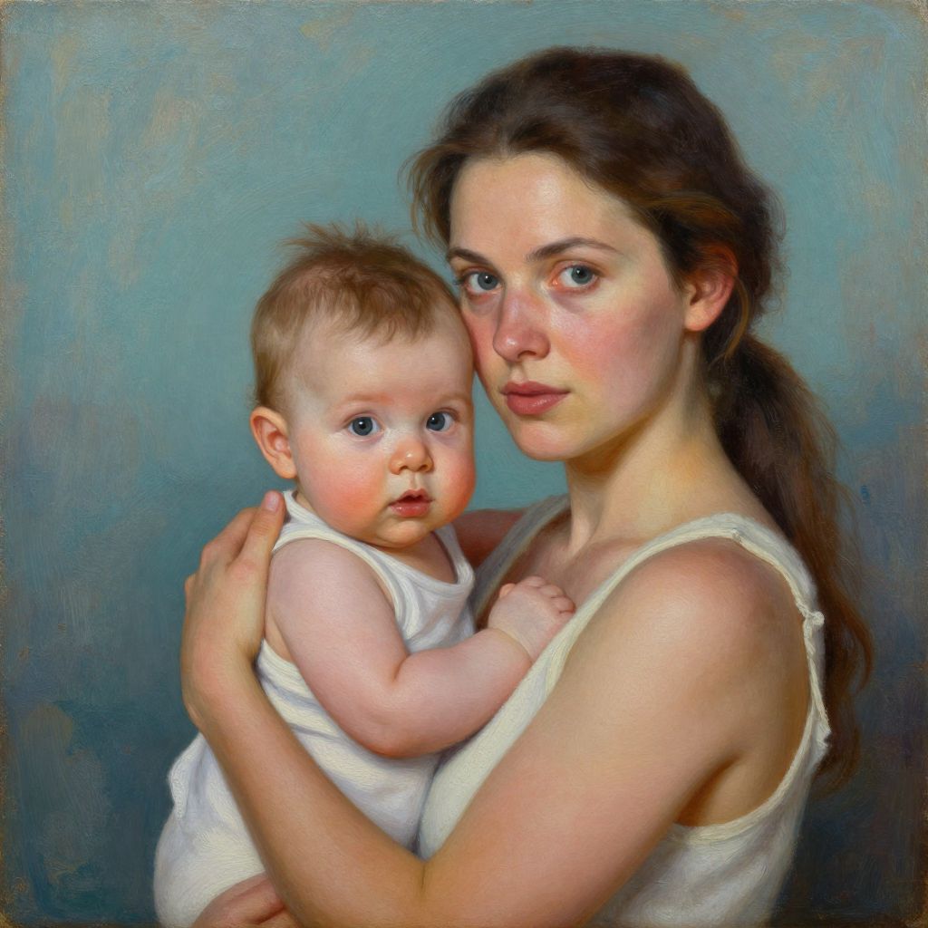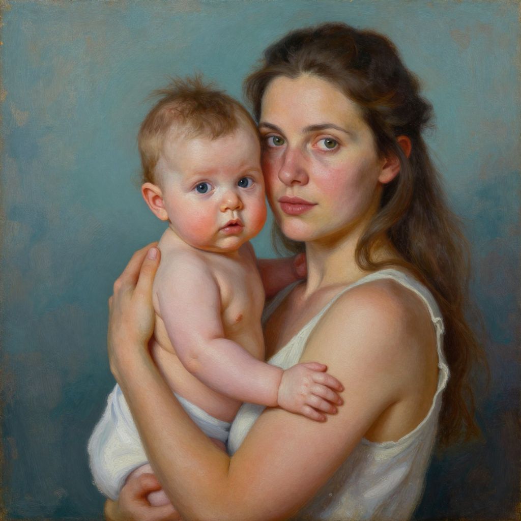 Stunning oil artwork depicts a tender moment between a mother and her child, with the woman cradling the baby close while both gaze directly at the viewer against a muted teal background.