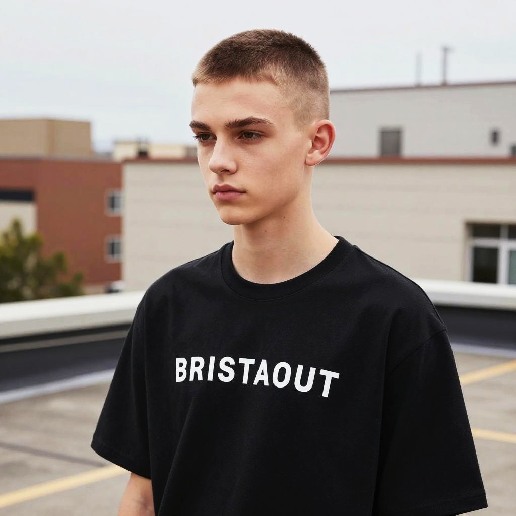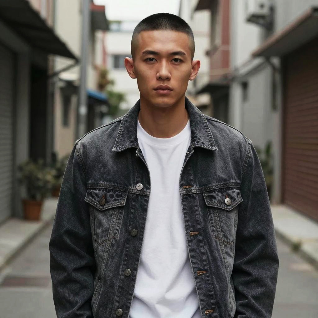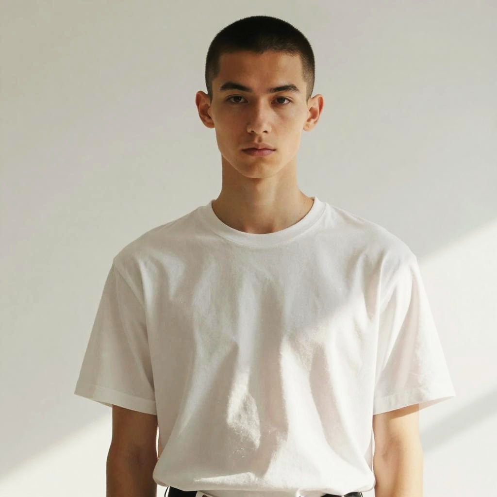 Buzz Cut hairstyle on male student, wearing minimalist outfit, in photo studio, captured in fashion editorial style with cinematic contrast.