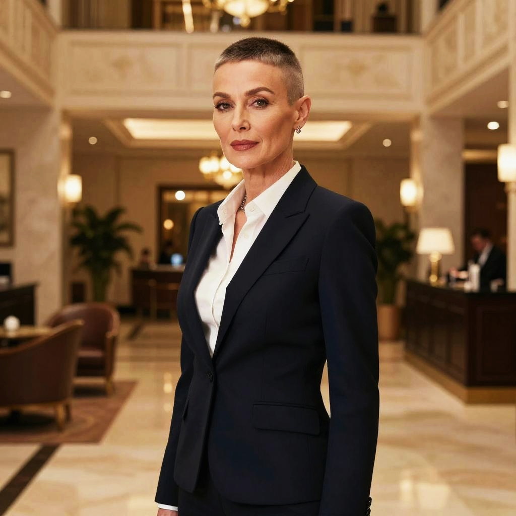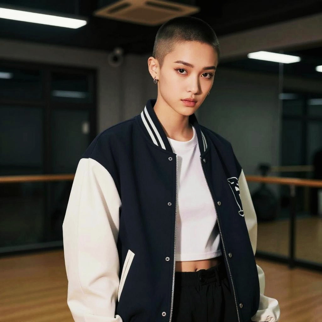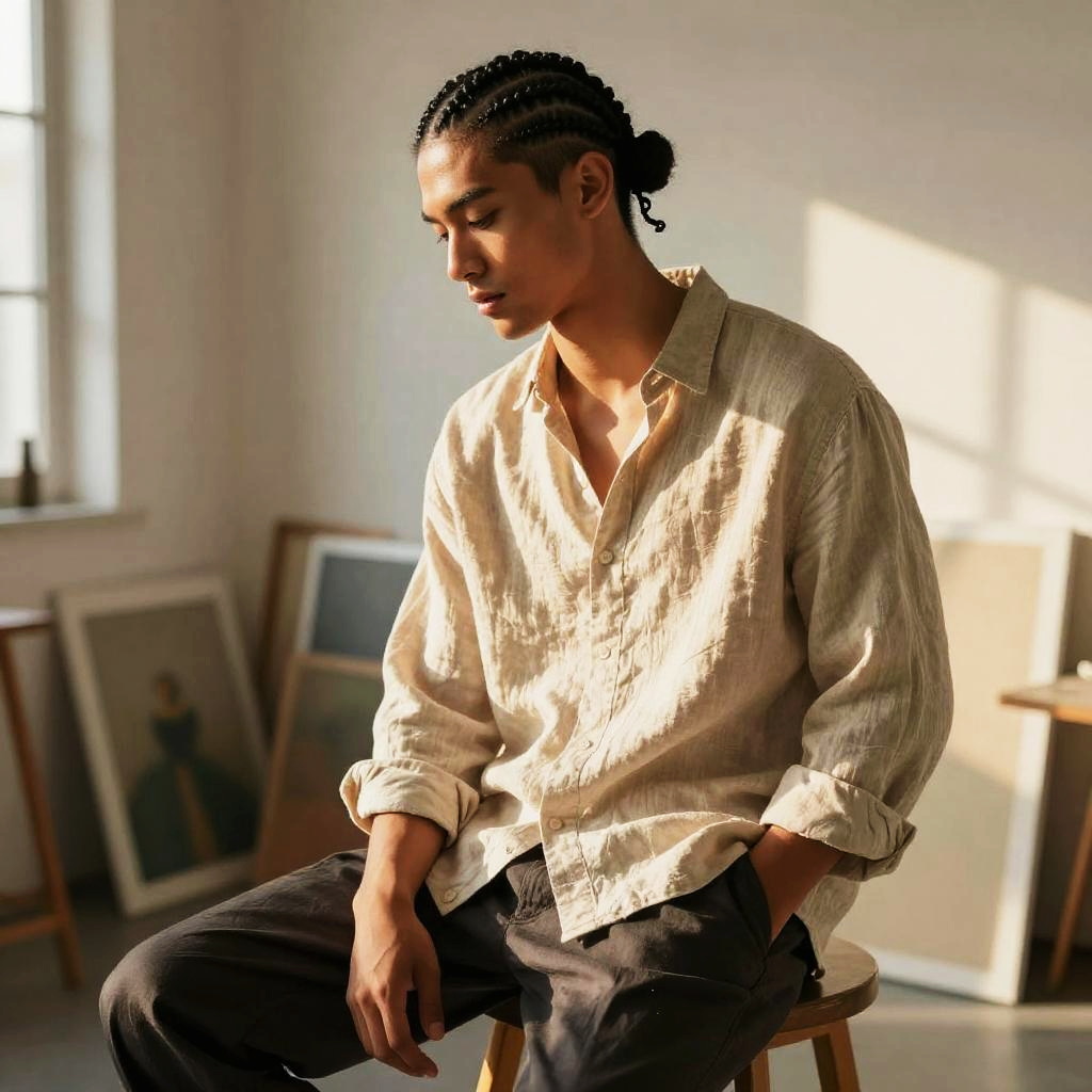 Buzz Cut hairstyle on male student, wearing minimalist outfit, in photo studio, captured in fashion editorial style with cinematic contrast.