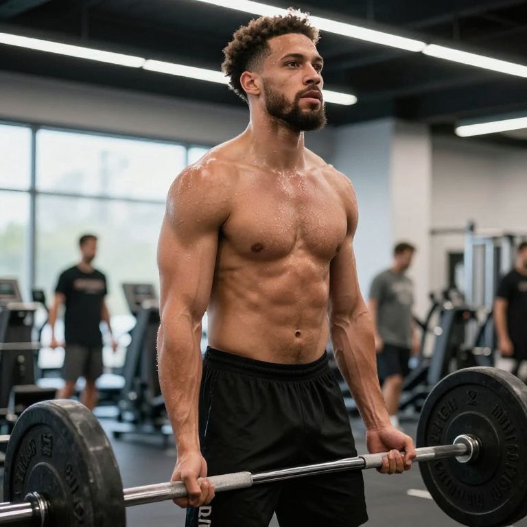 Rhys Hoskins shirtless, training session in gym, lifting weights with focused expression, sweat and muscle definition emphasized, modern sports environment, sharp realism, vibrant highlights