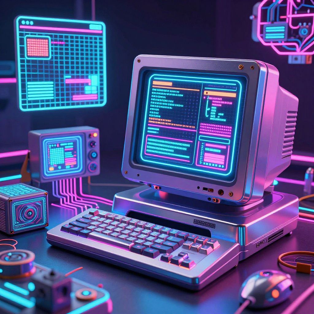 80s AI concept art, retro-futuristic computer with glowing neon circuits and pixelated interfaces, chrome and plastic mix, vibrant synthwave color palette, vintage tech aesthetic, glowing grids and wireframe models, digital nostalgia ambiance