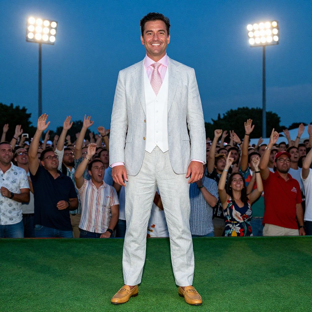 A man, light gray linen suit, white vest, soft pink dress shirt, textured silk tie, tan leather loafers, bright green turf, towering floodlights, vibrant cheering crowd, oversaturated film style, confident smile Man has masculine face and piercing eyes