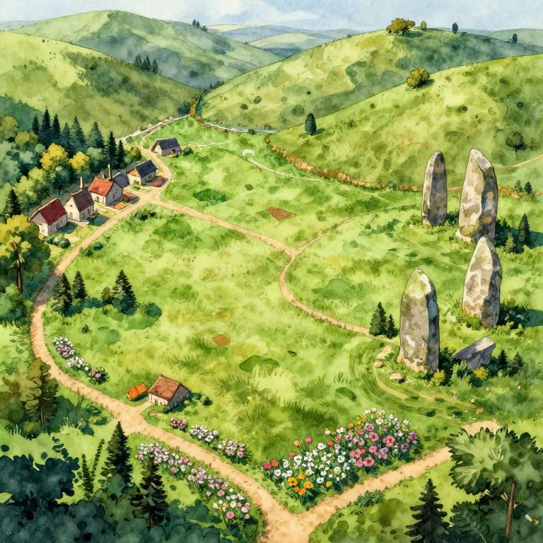 Fantasy open field DnD map depicting a lush green valley with gentle slopes, a small village at the edge, ancient standing stones, and pathways leading through dense flower beds, all highlighted by dynamic lighting and fine details in watercolor texture.