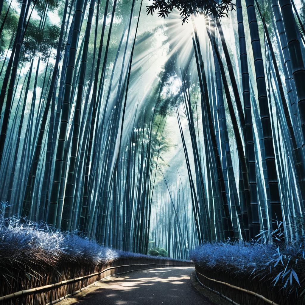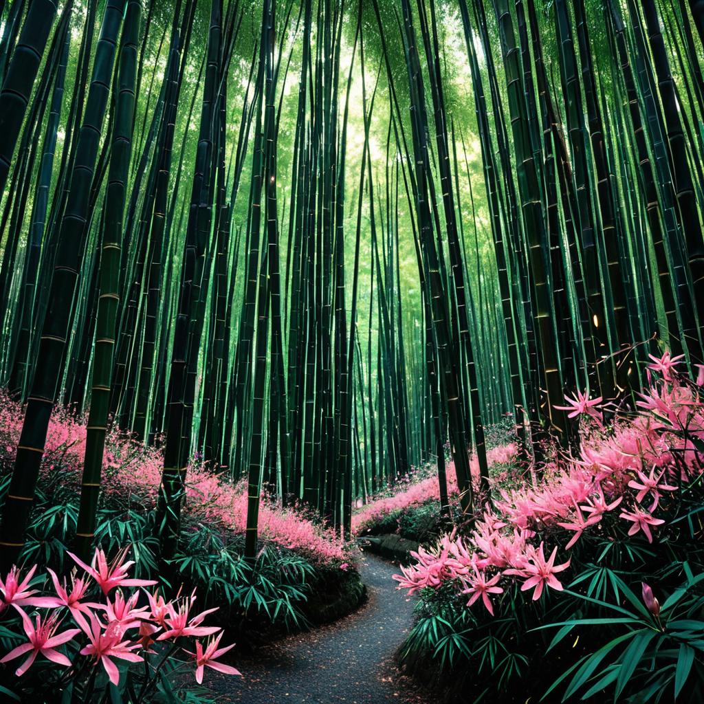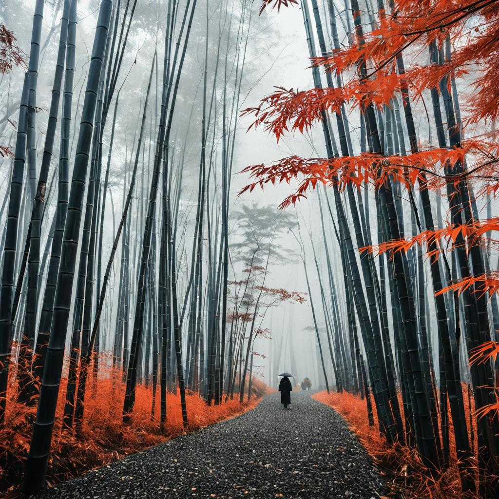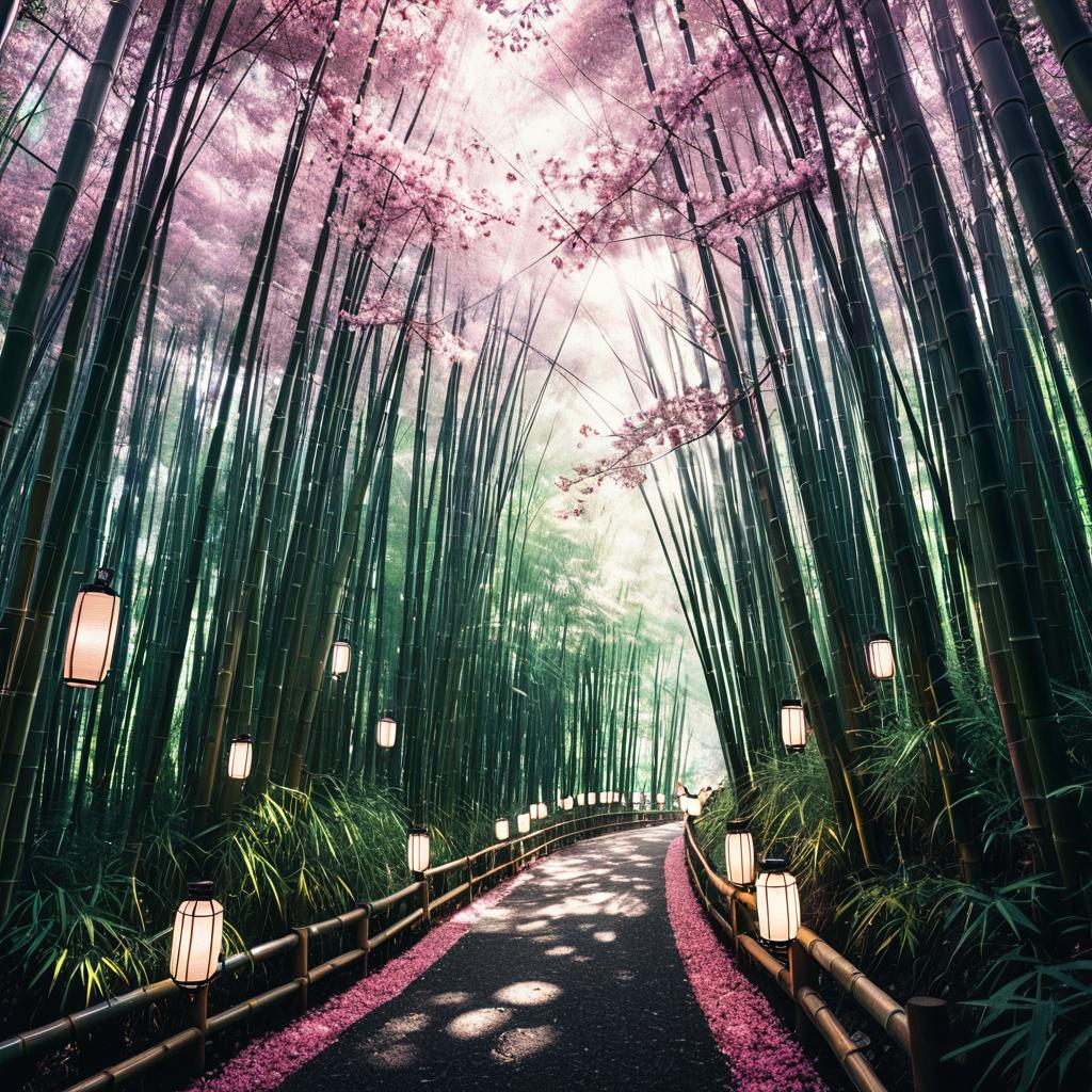 A serene bamboo forest pathway shrouded in mist at dawn, featuring delicate cherry blossom petals gently falling. The image combines traditional Japanese ink wash painting style with modern digital effects, showcasing intricate golden accents, elegant composition, detailed textures, smooth lighting, and sharp focus.