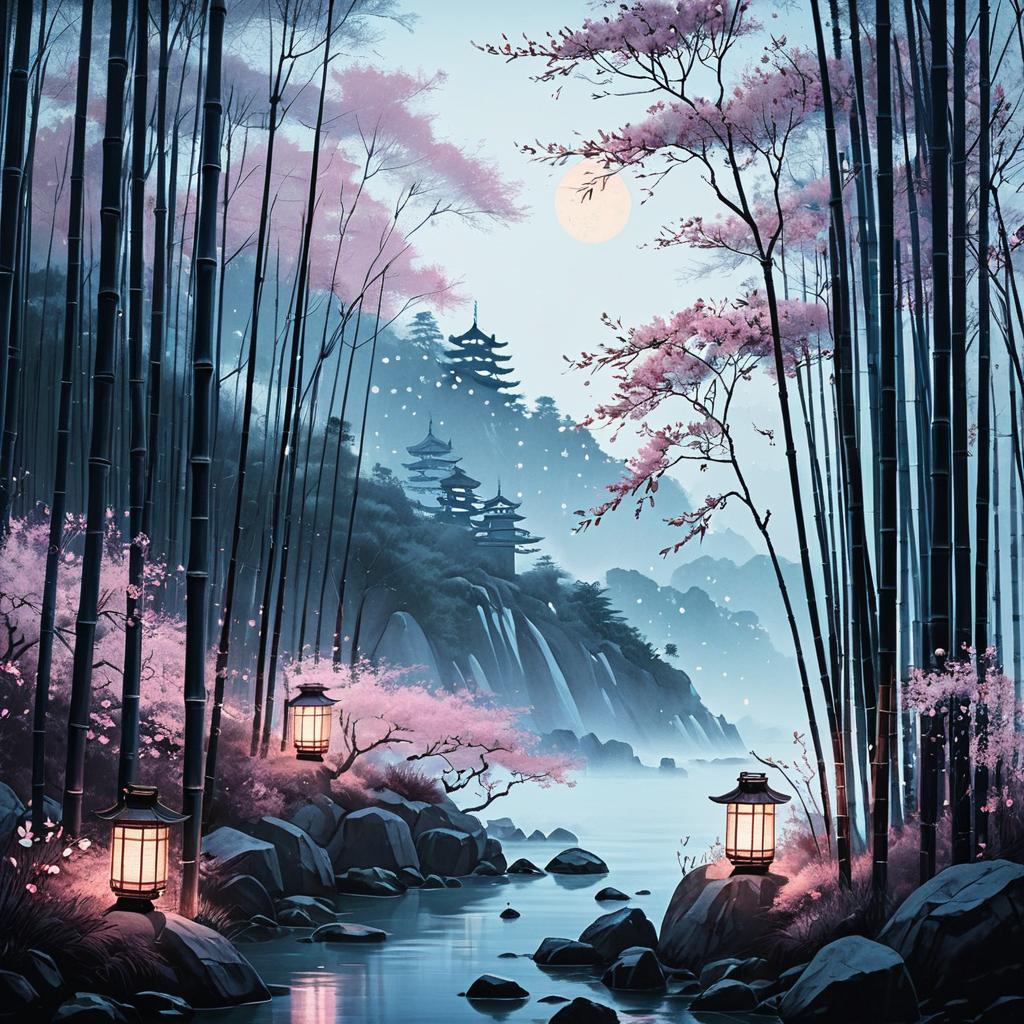 Cherry blossom petals falling gently in a bamboo forest at dawn with mist, rendered in Japanese ink wash painting with modern digital effects, with intricate golden accents, elegant composition, highly detailed textures, smooth lighting and sharp focus.