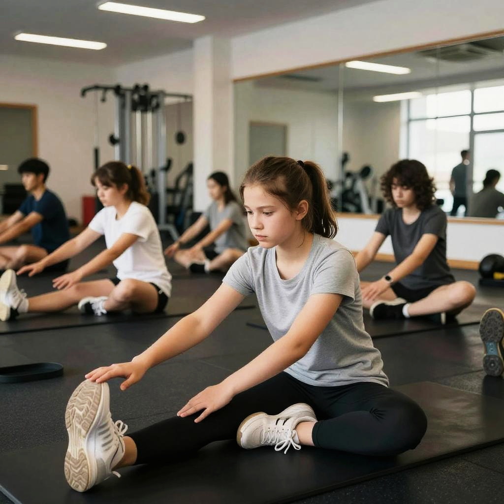 Teen bodybuilders stretching and warming up before a workout, in a spacious fitness studio with mirrors and equipment, high detail, soft natural lighting, youthful energy and determination