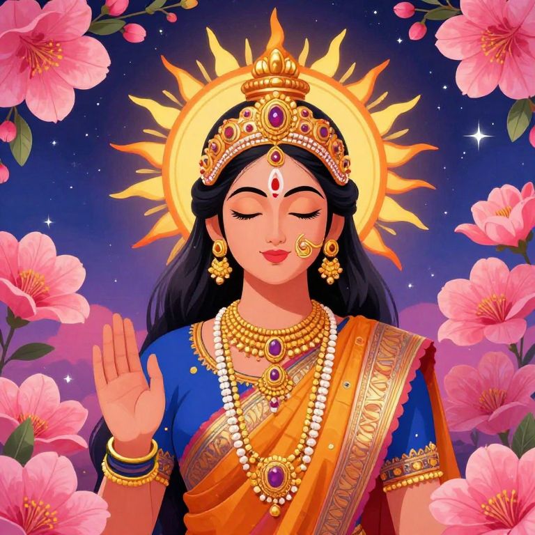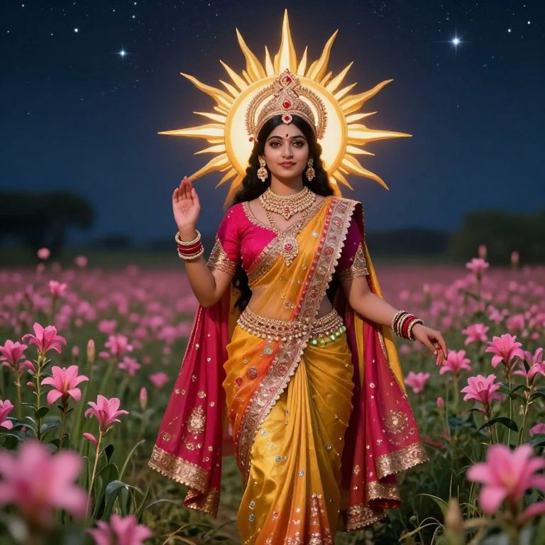 Radiant goddess adorned in vibrant Indian attire and a golden sunburst crown stands gracefully amidst a field of blooming pink flowers under a starry night sky.