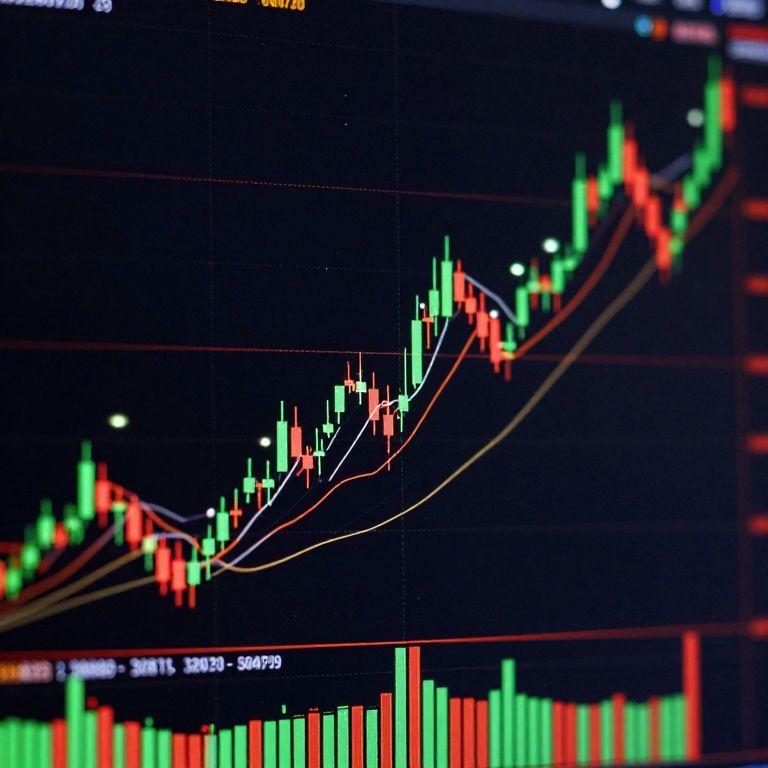 Photograph of a computer screen displaying a colorful stock market chart with red and green bars, zigzagging lines, and time grid against a dark background