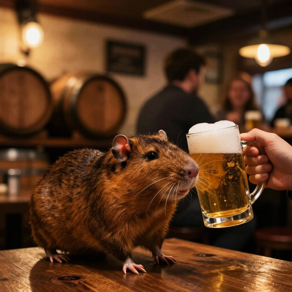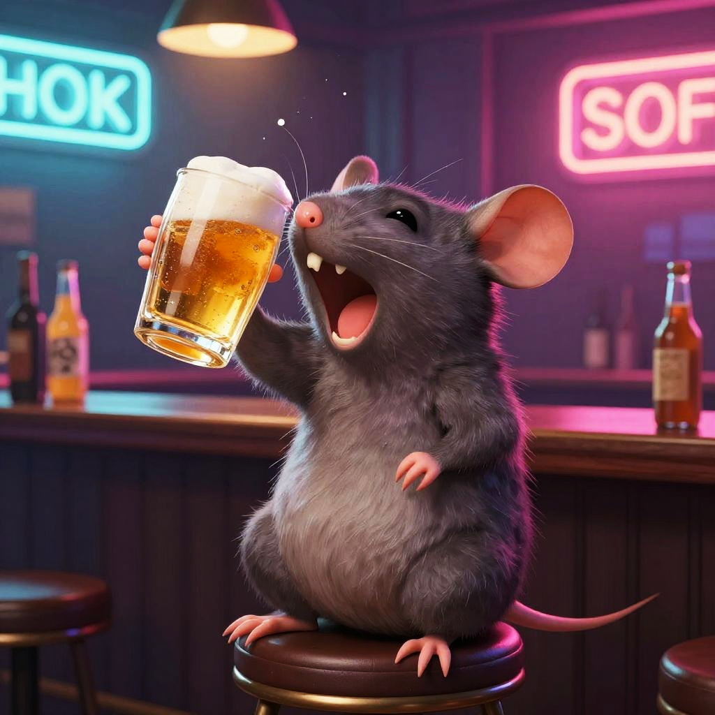 Photorealistic Rat Drinking Beer in Rustic Pub