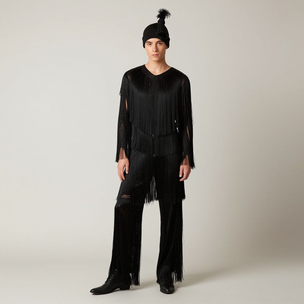 Black fringe flapper costume, solo, hat, male focus, 1boy, standing, black headwear, black footwear, full body