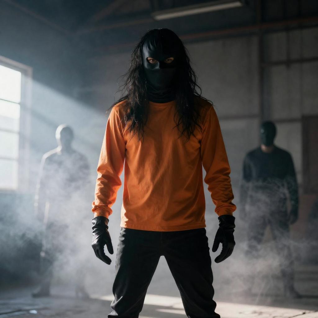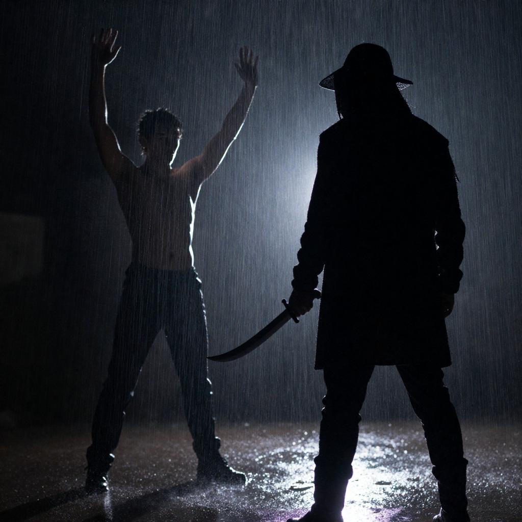 Photograph of a dramatic scene in a rain-soaked, dimly lit setting. A shirtless man with raised arms stands on the left, while a shadowy figure in dark clothing and a hat, wielding a curved blade, stands on the right. Rain heavily falls, creating a misty atmosphere. The background is dark, with a faint light source illuminating the scene from below.