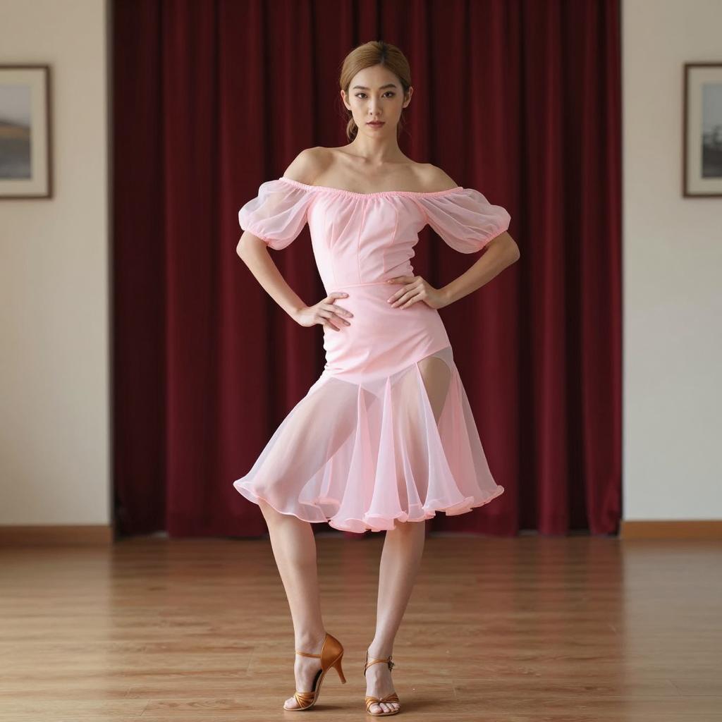 Dance costume sparkly, photograph of a young Asian woman with light brown skin, dark hair in an elegant updo, wearing a brown patterned spaghetti strap dress with intricate embroidery, standing in a well-lit room with white walls, natural sunlight casting a shadow on the right, neutral expression, soft lighting, high fashion, detailed ures, minimalist background, stylish, elegant, upper body shot, realistic, contemporary, fashion photography style