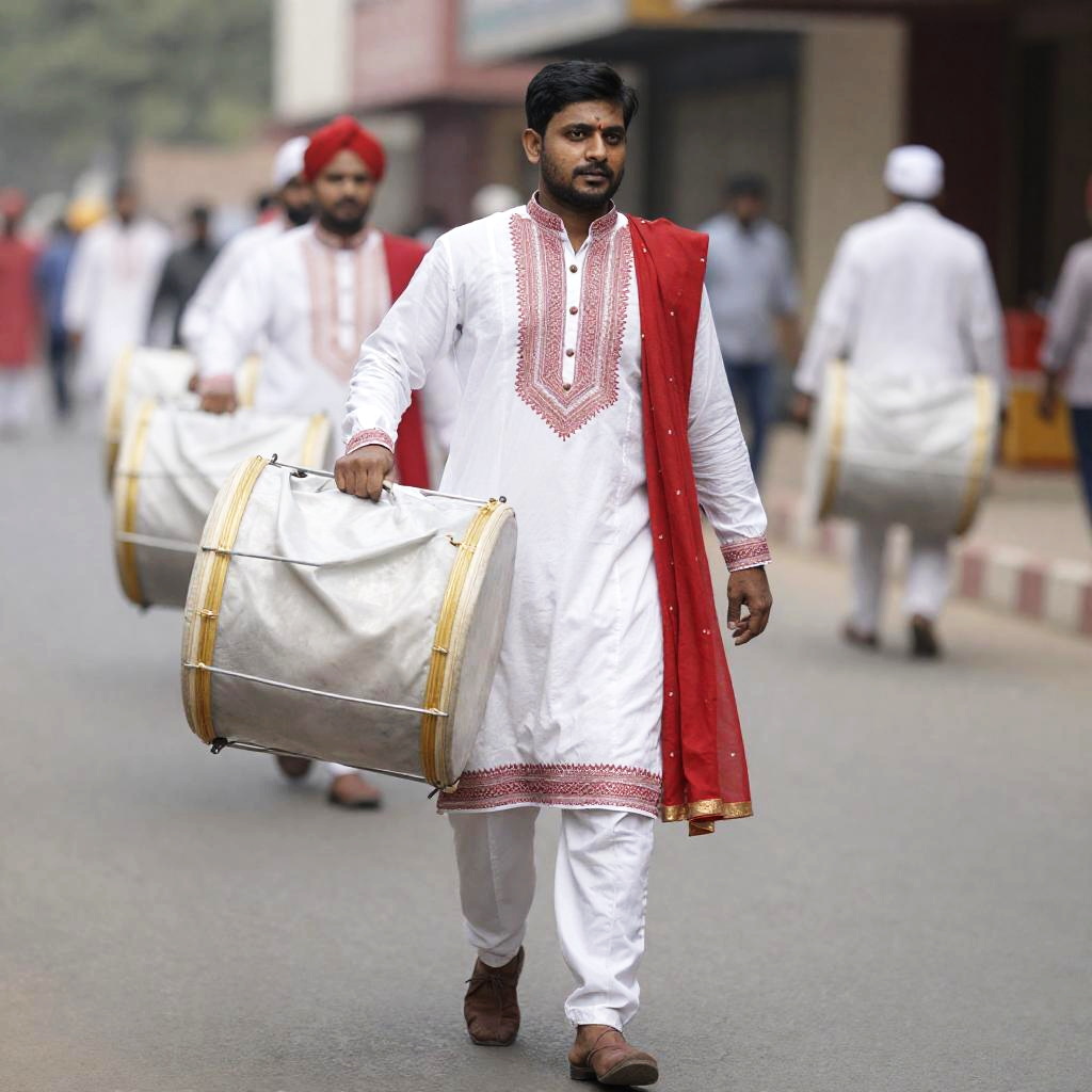 Nagada Sang Dhol Baje Dress Costume, man in red and white outfit walking down a street