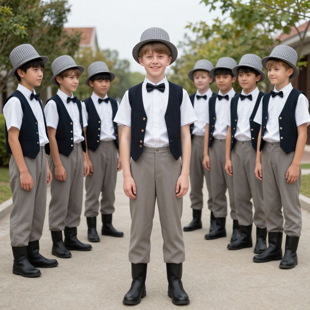 Photograph of seven young boys standing in a line on a suburban street. They wear identical outfits: white short-sleeved shirts, black vests, gray trousers, black bow ties, black boots, and patterned gray bowler hats. The boy in the center is smiling, while the others have neutral expressions. The background shows green trees and a blurred house. The boys appear to be of similar age, with light skin and short brown hair. The image has a slightly surreal, digitally altered quality, with a slight blur and bright colors.