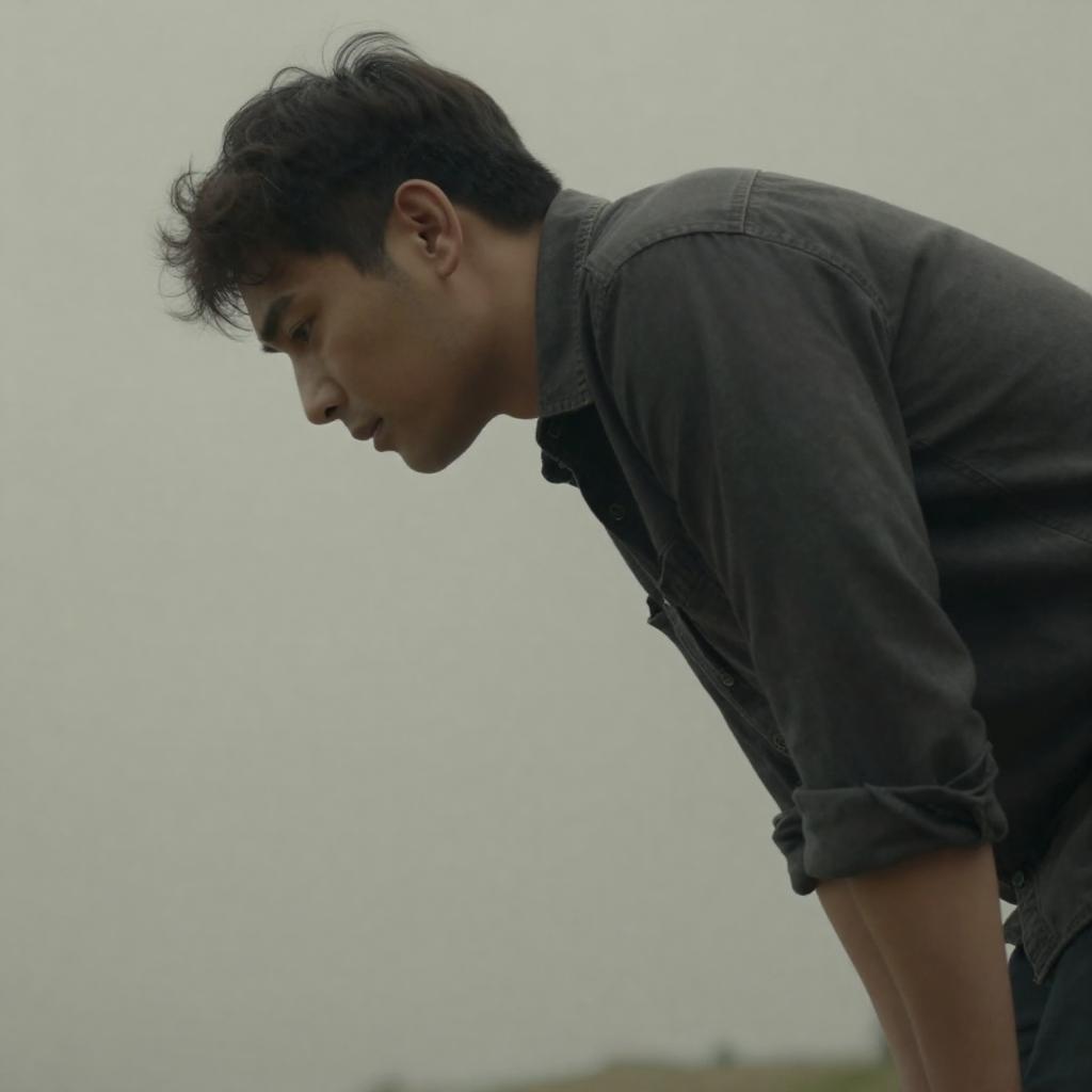 Portrait of an Asian man with short dark hair bending forward in a contemplative pose. He is dressed in a dark gray, long-sleeved button-up shirt with sleeves rolled up, set against a muted greenish-yellow hazy background.