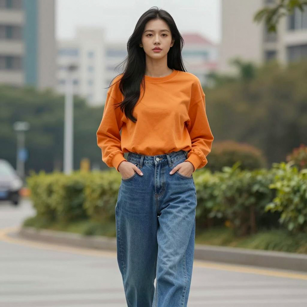 Young Asian woman with long dark hair sitting on concrete steps in front of a modern building. She is dressed in a beige track suit and black combat boots, with sunlight casting shadows. Her reflection is visible in the glass door behind her. The ground is paved with a checkered pattern.