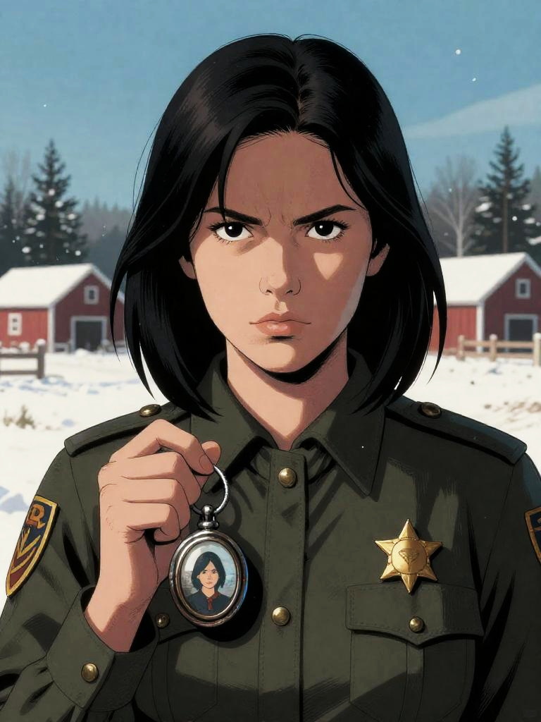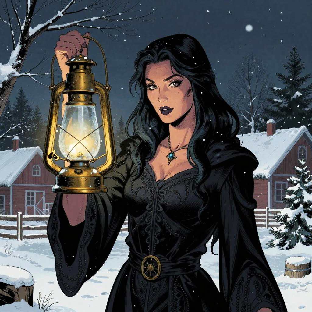 Wandering horse wrangler with tiny snowflake necklace, black hair, Christmas farm, frozen fog and gentle flurries, detailed, dark colors, dramatic, graphic novel illustration, 2d shaded retro comic book