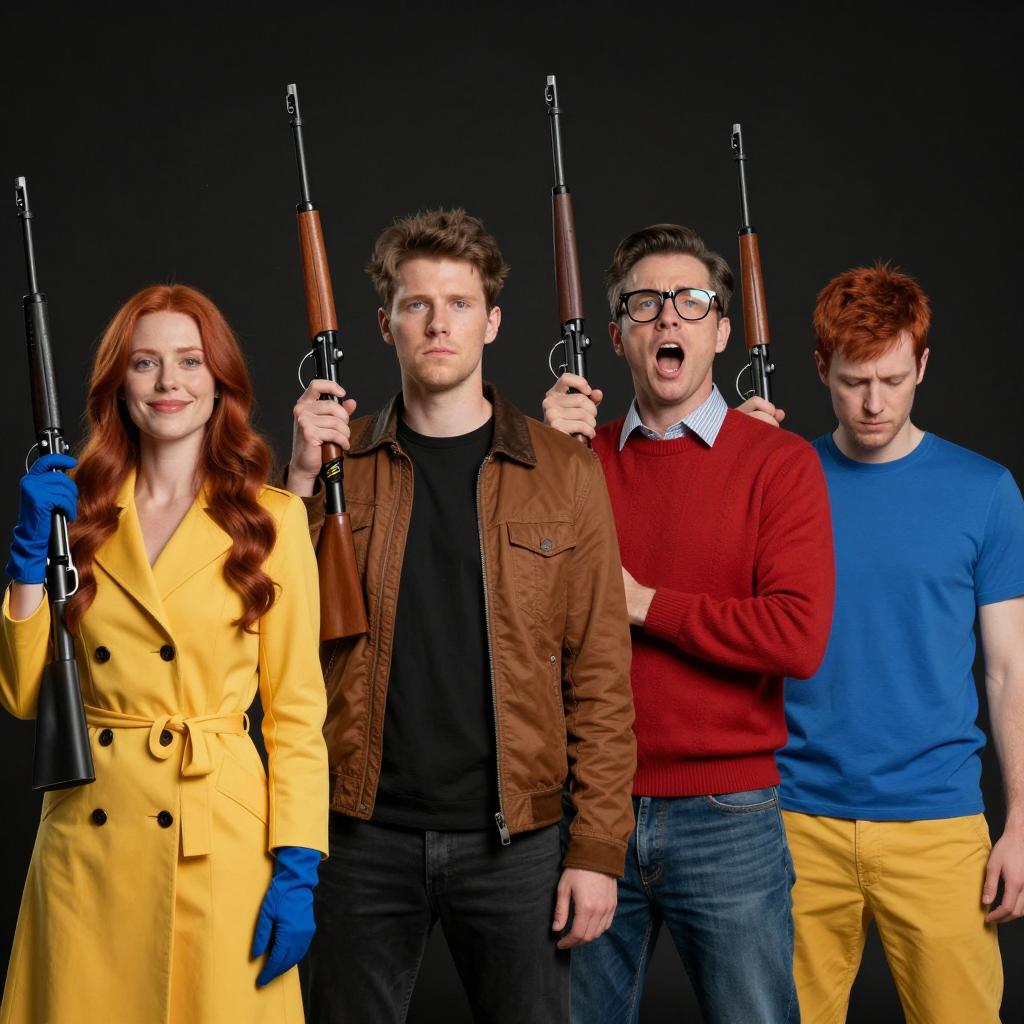 Man with glasses, brown cardigan with geometric pattern, brown pants, and white shirt sits on a chair. Red-haired woman with black-rimmed glasses, green and black dress, black tights, and red lipstick sits beside him. Dark room with packages and a taxidermy bird on a red shelf in the background. Woman looks at man, who looks slightly down. Both have intense expressions. Two people.