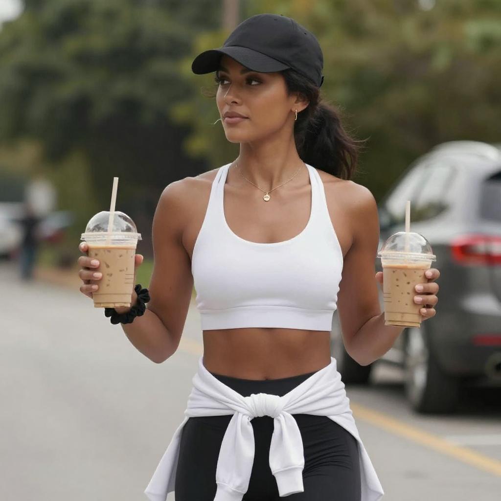 Photograph of a fit woman with long dark hair, wearing a white sports bra, black track jacket with white stripes, black track pants, and black sneakers. She holds a red quilted handbag in her left hand and a bubble tea with a green straw in her right. She is smiling and walking in a dimly lit parking garage.