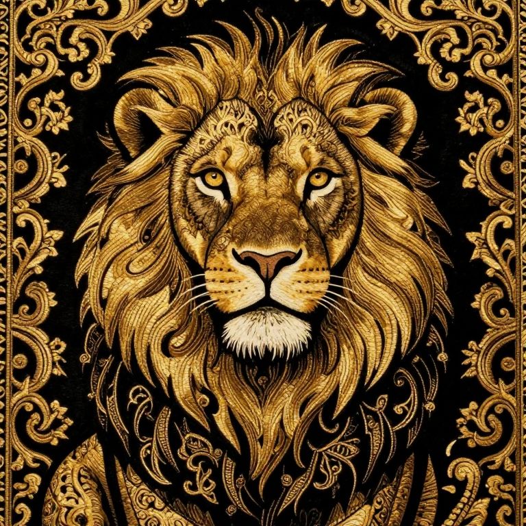 The image showcases a majestic lion, crafted with intricate details of a black and gold Kashmiri carpet pattern. The lion's mane and body are adorned with elaborate, swirling designs that exhibit a rich, luxurious texture. The lion's face is particularly striking, with a detailed pattern that covers its entire head, creating a sense of depth and complexity. The background features an ornate, golden scrollwork that complements the lion's intricate design, adding to the overall grandeur of the scene. The composition is centered, with the lion's gaze fixed directly at the viewer, exuding a sense of power and majesty. The use of 100mm and 80mm lenses suggests a close-up perspective, emphasizing the lion's detailed features and the fine artistry of the carpet pattern. The interplay of black and gold colors creates a striking contrast, highlighting the lion's regal presence against the intricate backdrop.