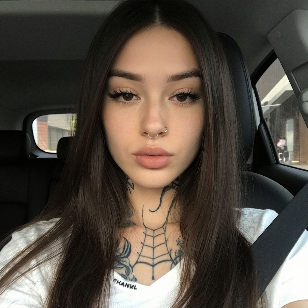 Photograph of a young woman with long, straight dark brown hair and light skin, sitting in a car. She has bold eyebrows, long eyelashes, and a nose ring. She's wearing a white Chanel shirt and has several tattoos on her chest and neck, including a spider web and flowers. She's looking directly at the camera with a neutral expression. The car's interior is visible in the background.