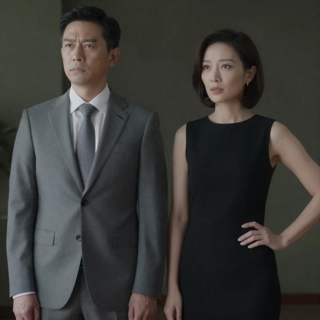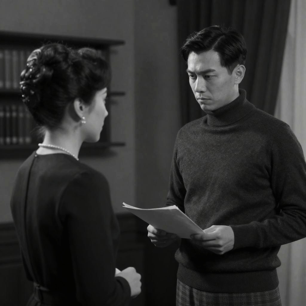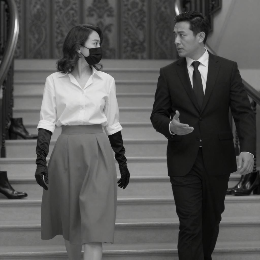 Black-and-white photograph of two people walking. Woman in white shirt, puffed skirt, black gloves, and mask. Man in black suit, white shirt, black tie, gesturing. Staircase, ornate wallpaper, scattered shoes in background. Intense expressions.