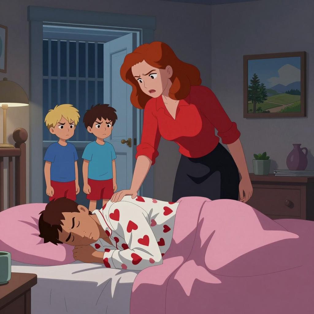 Digital illustration of a bedroom at night. A woman with red hair, wearing a red shirt and black skirt, stands over a man with short brown hair, lying face down on a bed with a pink blanket and heart-patterned pajamas. Two boys with blond hair and brown hair, wearing blue shirts and red shorts, stand in the doorway, both with angry expressions. Background includes a window with vertical blinds and a framed landscape painting.
